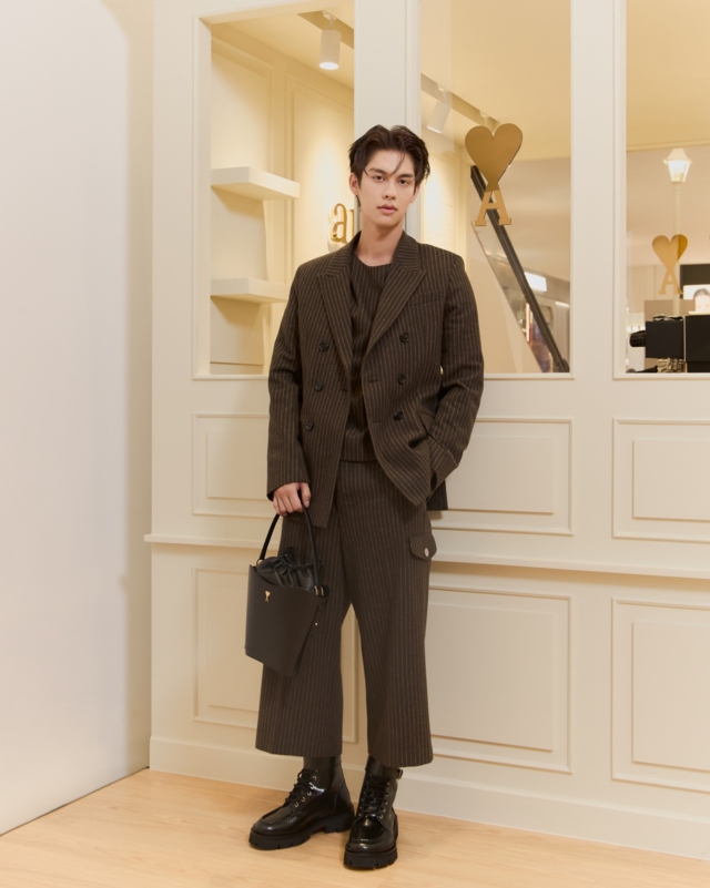 โดยวันนี้หนุ่ม ไบร์ท-วชิรวิชญ์ มาในลุคเรียบๆ แฝงความหรูหรา สวมเบลเซอร์ลายทางทับเสื้อตัวในพร้อมกางเกงเข้าเซ็ต สีน้ำตาล Dark Coffee แมตช์ด้วยกระเป๋ารุ่น Paris Paris Bucket Bag สีดำ คอมพลีตลุคอย่างมีสไตล์ด้วยรองเท้าหนัง Monk strap shoes สีดำ ทั้งหมดจากคอลเล็กชัน Fall/Winter 2024 ซึ่งทางแบรนด์ตั้งใจนำเสนอเครื่องแต่งกายสำหรับกลางวันและกลางคืน โดยสื่อถึงจิตวิญญาณความมั่นใจ ความเรียบหรู และสไตล์ความคลาสสิคของชาวปารีเซียง รวมไปถึงการนำเสนอความแตกต่างผ่านเอกลักษณ์เฉพาะตน และเสน่ห์ของการผสมผสานระหว่างความซับซ้อนกับความเรียบง่าย ซึ่งล้วนเป็นแนวคิดหลักที่ได้ถูกเน้นย้ำในดีเอ็นเอของอามีมาโดยตลอด