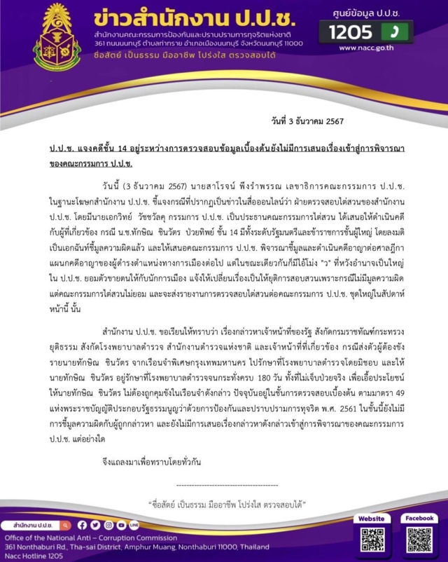 วันนี้ (3 ธันวาคม 2567) นายสาโรจน์ พึงรำพรรณ เลขาธิการคณะกรรมการ ป.ป.ช. ในฐานะโฆษกสำนักงาน ป.ป.ช. ชี้แจงกรณีที่ปรากฎเป็นข่าวในสื่ออออนไลน์ว่า ฝ่ายตรวจสอบไต่สวนของสำนักงาน ป.ป.ช. โดยมีนายเอกวิทย์ วัชชวัลดุ กรรมการ ป.ป.ช. เป็นประธานคณะกรรมการไต่สวน ได้เสนอให้ดำเนินคดีกับผู้ที่เกี่ยวข้อง กรณี น.ช.ทักษิณ ชินวัตร ป่วยทิพย์ ชั้น 14 มีทั้งระดับรัฐมนตรีและข้าราชการชั้นผู้ใหญ่ โดยลงมติเป็นเอกฉันท์ชี้มูลความผิดแล้ว และให้เสนอคณะกรรมการ ป.ป.ช. พิจารณาชี้มูลและดำเนินคดีอาญาต่อศาลฎีกาแผนกคดีอาญาของผู้ดำรงตำแหน่งทางการเมืองต่องต่อไป แต่ในขณะเดียวกันก็มีไอ้โม่ง "ว" ที่หวังอำนาจเป็นใหญ่ใน ป.ป.ช. ยอมตัวชายตนให้กับนักการเมือง แจ้งให้เปลี่ยนเรื่องเป็นให้ยุติการสอบสวนเพราะกรณีไม่มีมูลความผิด แต่คณะกรรมการไต่สวนไม่ยอม และจะส่งรายงานการตรวจสอบไต่ส่วนต่อคณะกรรมการ ป.ป.ช. ชุดใหญ่ในสัปดาห์หน้านี้นั้น