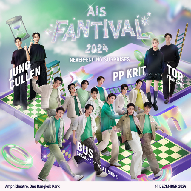 AIS เตรียมจัดงาน AIS FANTIVAL 2024 : Never-Ending Surprises, Never-Ending Happiness มอบประสบการณ์เซอร์ไพรส์ไม่มีสิ้นสุด พบกับไฮไลท์กิจกรรมให้ลูกค้าได้ร่วมสนุกและลุ้นรับของรางวัลตลอดทั้งวัน อาทิ Interactive Games, บูธถ่ายรูปกับพรีเซ็นเตอร์, ทิ้ง E-Waste รับ AIS Points, ใช้ AIS Points แลกรับขนมและเครื่องดื่มภายในงาน และอีกมากมาย พร้อมยกทัพพรีเซ็นเตอร์ AIS Family มารวมตัวกันสร้างสีสันด้วยโชว์สุดพิเศษอย่างเต็มรูปแบบเป็นครั้งแรก นำโดย ต่อ-ธนภพ, พีพี-กฤษฏ์, จอง-คัลแลน และ BUS (Because of you I Shine) ที่จะมาส่งต่อคำขอบคุณและคำมั่นสัญญาในการทำงานเพื่อลูกค้าและคนไทยด้วยความมุ่งมั่นต่อไป ชวนลูกค้า AIS พบกันในวันเสาร์ที่ 14 ธันวาคม 2567 ตั้งแต่เวลา 10.00 – 20.00 น. ที่ Amphitheatre, One Bangkok Park หรือรับชมฟรี ผ่าน AIS PLAY