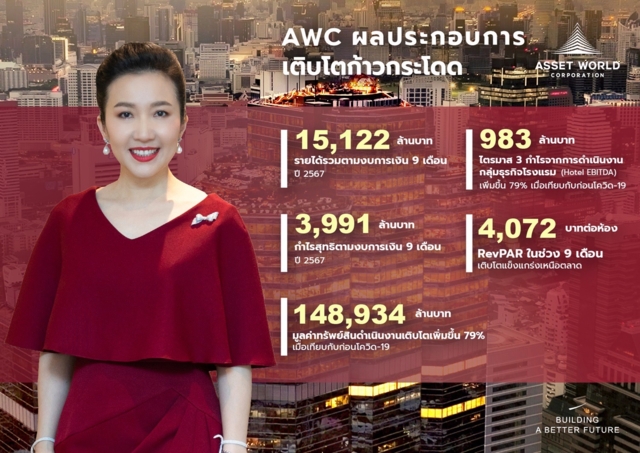 นางวัลลภา ไตรโสรัส ประธานเจ้าหน้าที่บริหาร และกรรมการผู้จัดการใหญ่ บริษัท แอสเสท เวิรด์ คอร์ป จำกัด (มหาชน) หรือ AWC เผย รายได้รวมและกำไรสุทธิ 9 เดือน