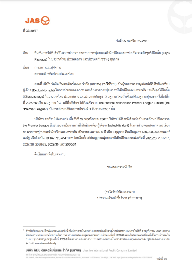 โดย JAS ได้รับหนังสือแจ้งเป็นลายลักษณ์อักษรจาก the Premier League เมื่อ 22 พฤศจิกายน 2567 ยืนยันอย่างเป็นทางการ ซึ่งเป็นสิทธิแต่เพียงผู้เดียว (Exclusive right) ในการถ่ายทอดสดรายการฟุตบอลพรีเมียร์ลีกและเอฟเอคัพ เป็นระยะเวลารวม 6 ปี หรือ 6 ฤดูกาล คิดเป็นมูลค่า 559,980,000 ดอลลาร์สหรัฐ หรือคิดเป็น 19,167,723,414 บาท โดยจะเริ่มตั้งแต่ต้นฤดูกาลฟุตบอลพรีเมียร์ลีก และเอฟเอคัพที่ 2025/26, 2026/27. 2027/28, 2028/29. 2029/30 และ 2030/31