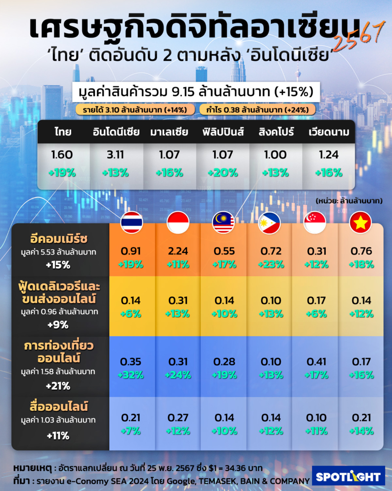 สำหรับประเทศไทย เศรษฐกิจดิจิทัลเติบโตในอัตรา 19% มูลค่ารวมแตะ 46,000 ล้านดอลลาร์สหรัฐฯ หรือประมาณ 1.60 ล้านล้านบาท เป็นรองเพียงอินโดนีเซีย โดย 'อีคอมเมิร์ซ' ยังคงเป็นแรงขับเคลื่อนสำคัญ ด้วยมูลค่าการเติบโตที่ 26,000 ล้านดอลลาร์สหรัฐฯ หรือประมาณ 905,000 ล้านบาท เพิ่มขึ้น 19% เช่นกัน ทั้งนี้ 'วิดีโอคอมเมิร์ซ' มีส่วนช่วยดึงดูดความสนใจของผู้บริโภคด้วยประสบการณ์การซื้อสินค้าแบบอินเทอร์แอ็กทีฟและคอนเทนต์ที่ดึงดูดใจ