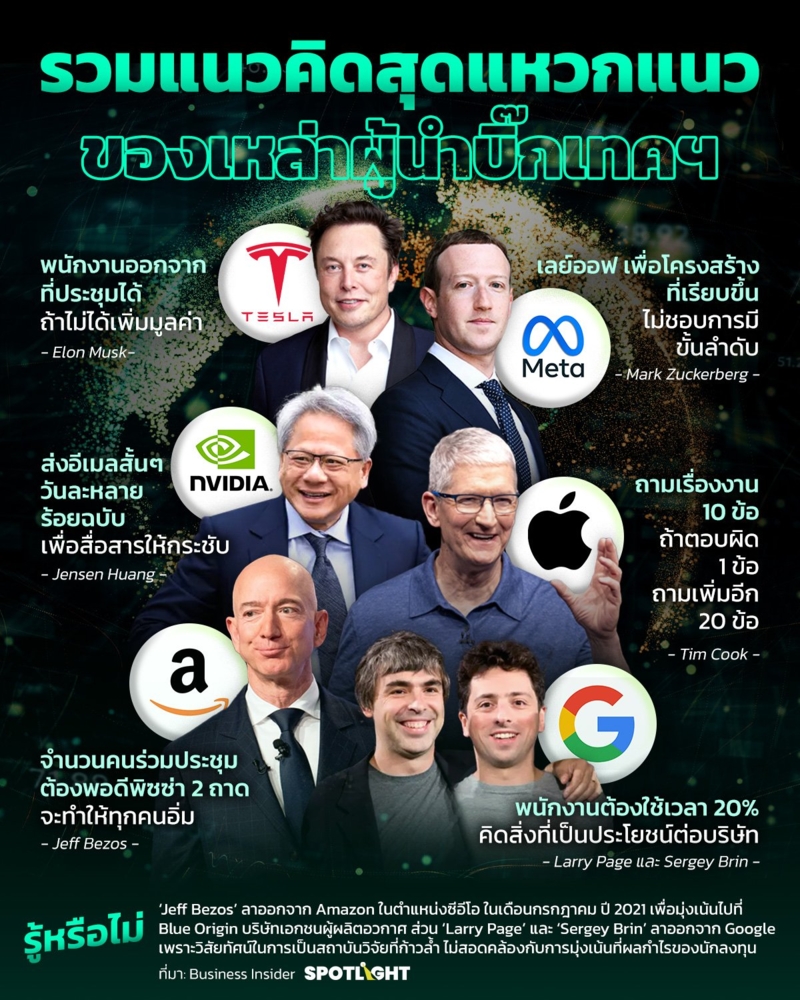 แต่หากพูดถึงเหล่าผู้บริหารบิ๊กเทคฯ เชื่อว่า คนจำนวนมากอาจสงสัยว่า พวกเขาเหล่านี้ มีแนวคิดในการบริหารบริษัทที่มีมูลค่าสูงติดอันดับโลกขนาดนี้ได้อย่างไร มีแนวคิดอะไรบ้างที่ทำให้พวกเขาประสบความสำเร็จได้ขนาดนี้