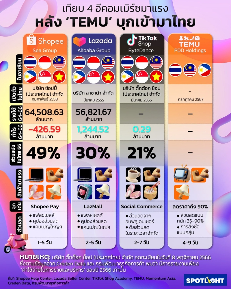SPOTLIGHT เทียบ 4 แพลตฟอร์มอีคอมเมิร์ซมาแรงในตลาดไทย "Shopee, Lazada, TikTok Shop, และ TEMU" ที่กำลังแข่งขันกันดุเดือด แย่งชิงผู้ใช้งานต่อเนื่อง