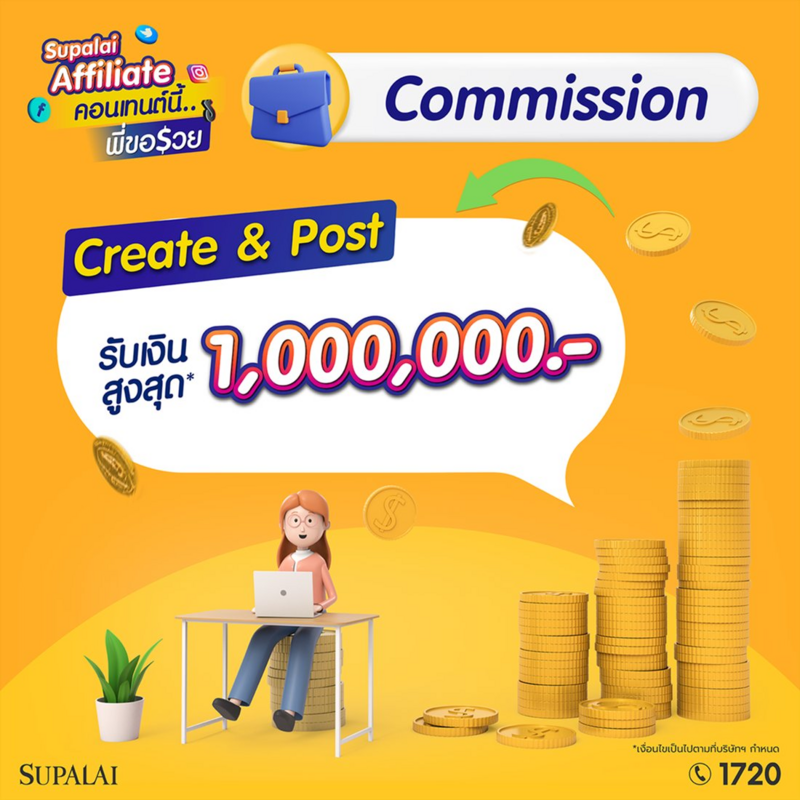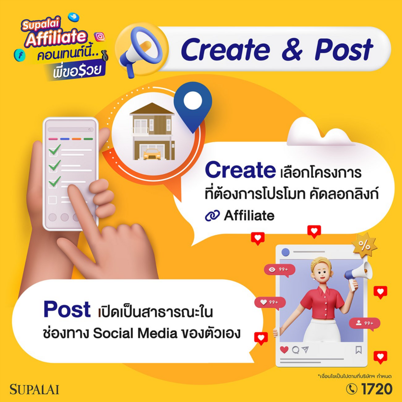 ครีเอเตอร์เตรียมตัวรวยได้เลย เพียงสมัคร - โพสต์ - รับเงิน ง่ายๆ แค่สร้างคอนเทนต์โดนใจ ไม่ว่าจะเป็นรีวิวภาพนิ่ง หรือ วีดีโอ นำเสนอได้ทุกรูปแบบคอนเทนต์ สไตล์คุณ ในโครงการคุณภาพของศุภาลัยที่สนใจ ทั้งบ้านเดี่ยว บ้านแฝด ทาวน์โฮม 39 โครงการ ราคา 1.41 - 30 ล้านบาท และคอนโดมิเนียม 14 โครงการ ราคา 1.19 - 104 ล้านบาท บนทำเลที่หลากหลาย ครอบคลุมทั้งกรุงเทพฯ และปริมณฑล พร้อมโพสต์ & แชร์ ไปยังช่องทางโซเชียลมีเดียของตัวเอง เลือกได้ตามใจชอบ ไม่ว่าจะเป็น Facebook , TikTok , Instagram , X และ Youtube เพียงแค่ลูกค้าลงทะเบียนผ่านลิงค์จากคอนเทนต์ของผู้สมัคร และเข้าเยี่ยมชมโครงการ รับค่าตอบแทนไปเลย 500 บาท / คน* รวมทั้งเมื่อลูกค้าทำการจองและโอนกรรมสิทธิ์ ผู้สมัครจะได้รับค่าคอมมิชชันตอบแทนสูงสุด 1 ล้านบาท* (*เงื่อนไขเป็นไปตามที่บริษัทฯ กำหนด) เริ่มทำแคมเปญได้ตั้งแต้วันนี้ – 30 ธ.ค.67 เท่านั้น