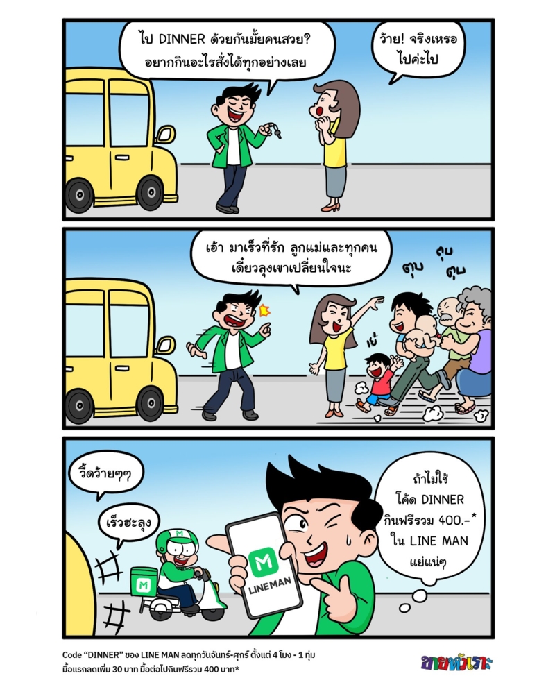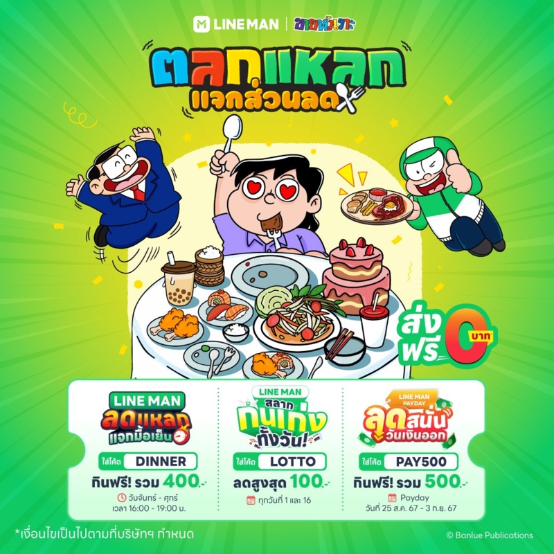 ‘LINE MAN’ ผู้นำแพลตฟอร์มออนดีมานด์ของไทย และ ‘ขายหัวเราะ’ ตำนานการ์ตูนสุดกวนที่ครองใจคนไทยมาอย่างยาวนาน ส่งแคมเปญสุดเจ๋ง ‘ตลกแหลก แจกส่วนลด’ เสิร์ฟแก๊กแซวคนไทยให้ฮาลั่นพร้อมส่วนลดสุดคุ้มให้กับทุกช่วงเวลา ไม่ว่าจะเป็นมื้อเย็นวันธรรมดา วันหวยออก หรือวันเงินเดือนออก