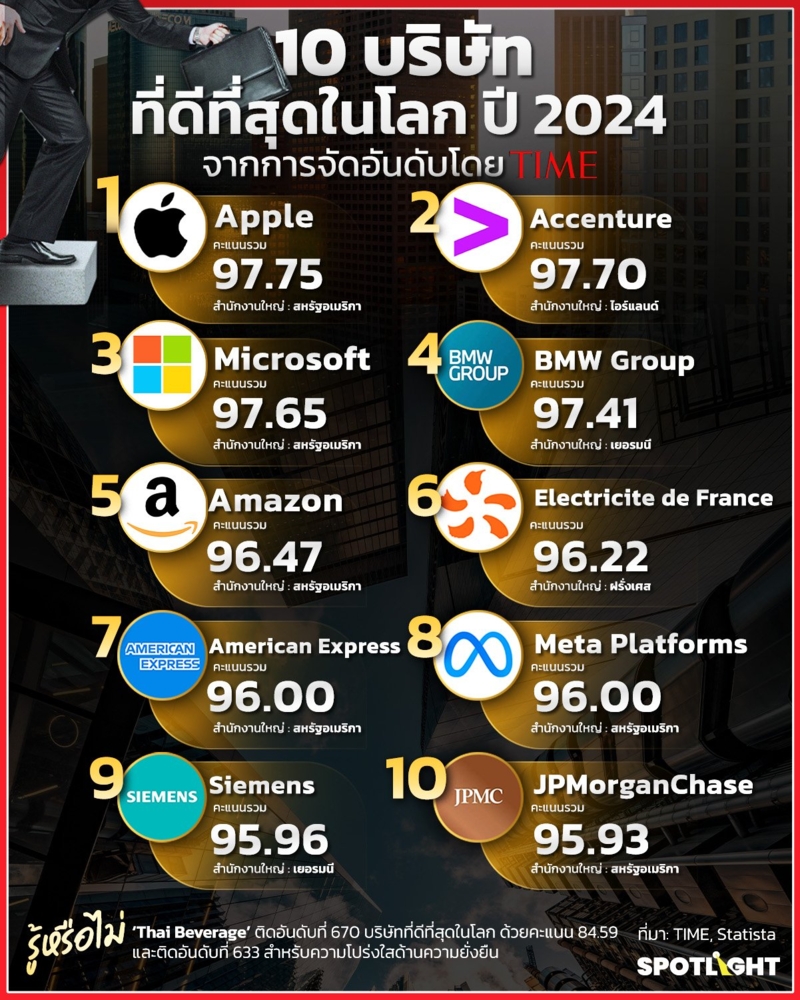 ทั้งนี้ SPOTLIGHT ได้รวบรวม 10 บริษัทที่ดีที่สุดในโลกประจำปี 2024 มาไว้ในบทความนี้แล้ว