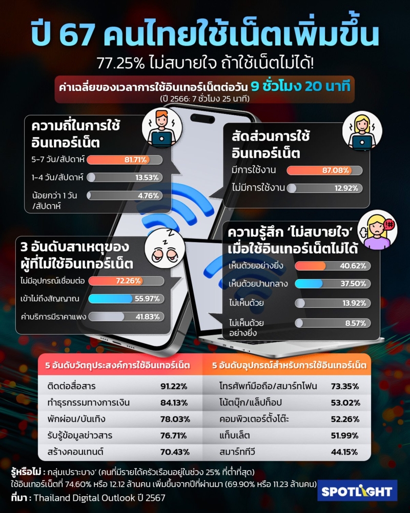 การใช้งานอินเทอร์เน็ตของคนไทยเพิ่มขึ้นอย่างต่อเนื่อง โดยเฉพาะในปี 2567 นี้ ที่ค่าเฉลี่ยแตะ 9 ชั่วโมง 20 นาที ตามที่สำนักงานคณะกรรมการดิจิทัลเพื่อเศรษฐกิจและสังคมแห่งชาติ เผยแพร่ข้อมูลผลการศึกษา จากโครงการศึกษา ‘Thailand Digital Outlook ประจำปี 2567’