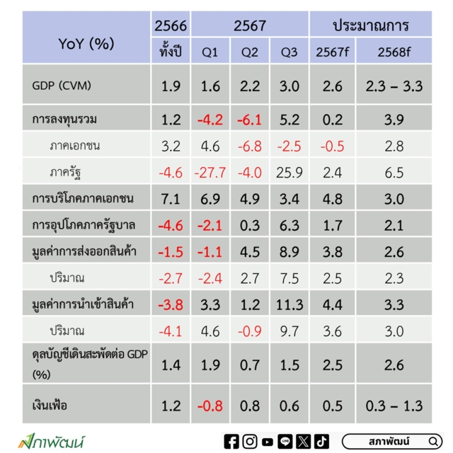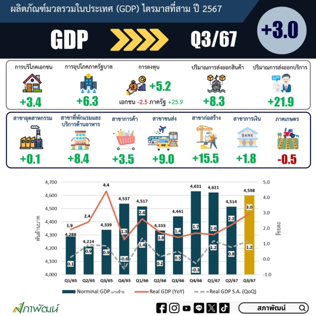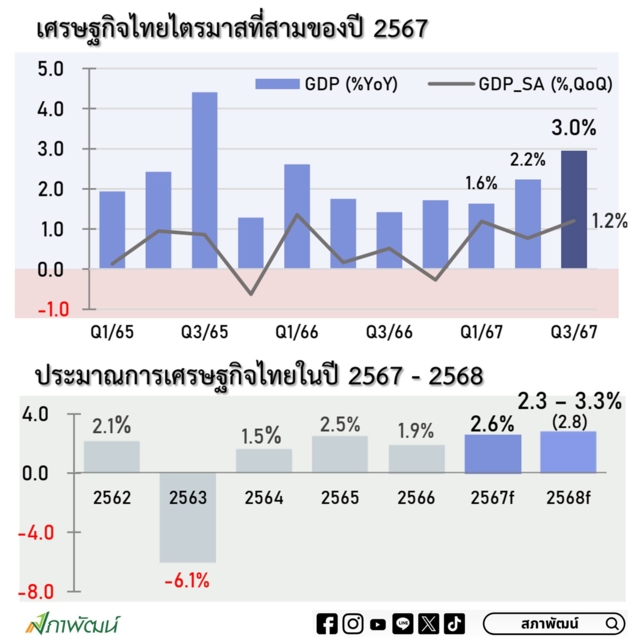 "สภาพัฒน์" เปิด GDP ไตรมาส 3/67 โต 3% ฟื้นตัวจากลงทุนภาครัฐ +26%