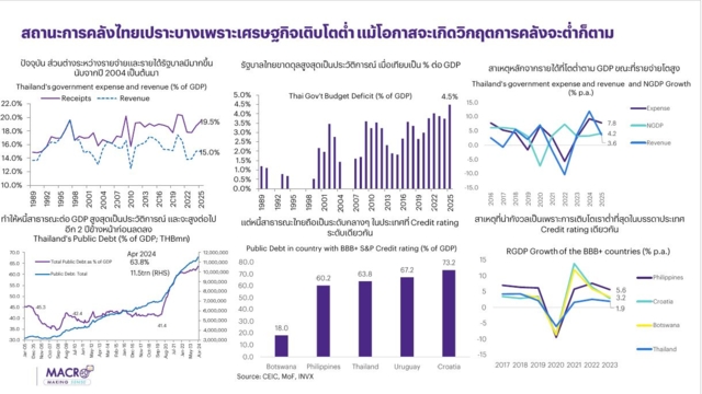 ขณะที่ความเห็นของนักเศรษฐศาสตร์ อย่างดร.ปิยศักดิ์ มานะสันต์ หัวหน้านักวิจัยเศรษฐกิจฝ่ายกลยุทธ์การลงทุน บริษัทหลักทรัพย์ อินโนเวสต์เอ็กซ์ จํากัด ยอมรับว่า ประเทศไทยมีความเสี่ยงด้านการคลังมากขึ้นเรื่อยๆ เพราะเศรษฐกิจไทยขยายตัวในอัตราที่ต่ำ การขาดดุลงบประมาณจึงสูงขึ้น อย่างล่าสุดงบประมาณปี 2568 เราขาดดุลสูงสุดเป็นประวัติการณ์ที่ราว 4.5% ของจีดีพี ในระยะยาวมีความน่าเป็นห่วง เปรียบเหมือนสึนามิที่มองเห็นอยู่ไกลๆกำลังเคลื่อนเข้ามาหาเราแต่หากเทียบกับกลุ่มประเทศยุโรป PIIGS คือตัวย่อของชื่อประเทศที่มีปัญหาเรื่องหนี้สาธารณะสูงในช่วงปี 2012 คือ โปรตุเกสไอร์แลนด์ อิตาลี กรีซ สเปน เราก็ยังไม่ถึงกับวิกฤตเช่นนั้น