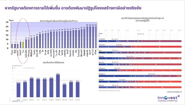 สำหรับแนวทางภาษีเงินได้บุคคลธรรมดา และนิติบุคคล นั้นหากเทียบกับประเทศเพื่อนบ้านก็พบว่าไทยเรายังสามารถปรับได้เพื่อให้เกิดการแข่งขันมากขึ้น เช่น ภาษีเงินได้นิติบุคคล 20% ของไทยยังอยู่ในระดับสูงหากเทียบกับประเทศต่างๆ การปรับเหลือ 15% ช่วยลดต้นทุนให้กับธุรกิจ ดึงดูดความน่าสนใจในการเข้ามาทำธุรกิจในไทยมากขึ้น แต่ก็ต้องแลกกับรายได้ที่หายจะไปมากเช่นเดียวกัน