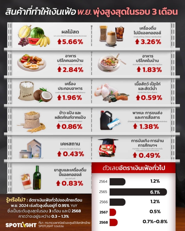 เงินเฟ้อพุ่ง! ดัชนีราคาผู้บริโภค (CPI) เดือนพฤศจิกายน 2567 พุ่งสูงขึ้น 0.95% เทียบกับปีก่อนหน้า สาเหตุหลักมาจากราคาน้ำมันดีเซลที่เพิ่มขึ้น ราคาอาหารและเครื่องดื่มที่สูงขึ้น โดยเฉพาะผลไม้สด เครื่องประกอบอาหาร และเครื่องดื่มไม่มีแอลกอฮอล์