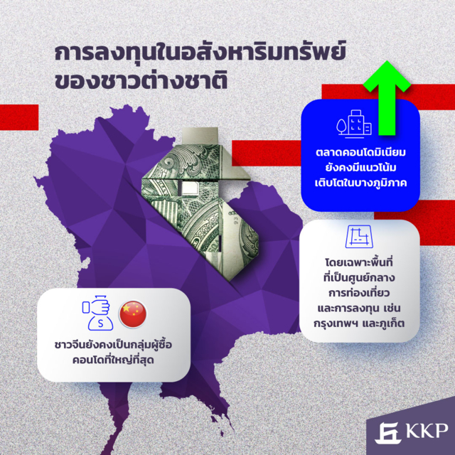 ตลาดการซื้อคอนโดของชาวต่างชาติ โดยเฉพาะกลุ่มนักลงทุนจีนและรัสเซีย จะยังคงเป็นปัจจัยที่สำคัญในการขับเคลื่อนตลาดคอนโดในพื้นที่กรุงเทพฯ และจังหวัดท่องเที่ยว เช่น ภูเก็ต พัทยา การพัฒนาของระบบโครงสร้างพื้นฐาน เช่น โครงการรถไฟฟ้าและสนามบินจะช่วยกระตุ้นการลงทุนในกลุ่มนี้เพิ่มขึ้น แต่การฟื้นตัวของกำลังซื้อชาวจีนจะขึ้นอยู่กับเศรษฐกิจโลกและการฟื้นตัวของเศรษฐกิจจีนเป็นหลัก