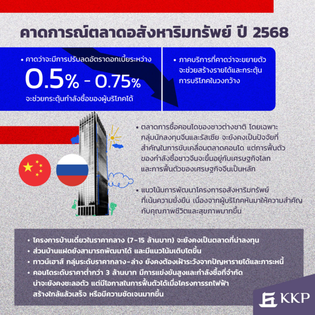 KKP คาดว่า แนวโน้มปี 2568 จะมีการฟื้นตัวแบบช้าๆ โดยมีปัจจัยบวกจากการลดดอกเบี้ยและการขยายตัวของภาคบริการ อย่างไรก็ตาม ตลาดคอนโดราคาต่ำยังคงเผชิญความท้าทายสูง ในขณะที่ตลาดแนวราบ โดยเฉพาะบ้านเดี่ยวระดับกลาง จะยังคงเป็นกลุ่มที่น่าสนใจในการลงทุน
