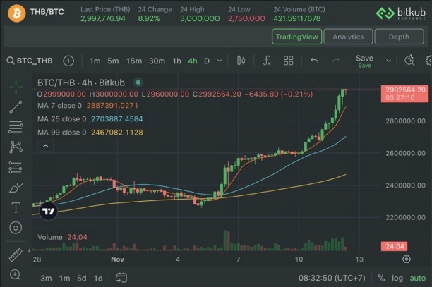 ขณะเดียวกัน บนแพลตฟอร์มซื้อขายสินทรัพย์ดิจิทัล Bitkub Exchange ในประเทศไทย ราคาบิตคอยน์ก็ปรับตัวสูงขึ้นอย่างร้อนแรงเช่นเดียวกัน โดย ณ วันที่ 12 พฤศจิกายน 2567 ราคา 1 BTC ทะลุ 3,000,000 บาท โดยมีราคาซื้อขายอยู่ที่ 2,997,776 บาท คิดเป็นอัตราการเปลี่ยนแปลงเพิ่มขึ้น 8.92% ภายในระยะเวลา 24 ชั่วโมง โดยมีราคาสูงสุดที่ 3,000,000 บาท และราคาต่ำสุดที่ 2,750,000 บาท (อ้างอิงข้อมูลจาก https://www.bitkub.com/th/market/btc)