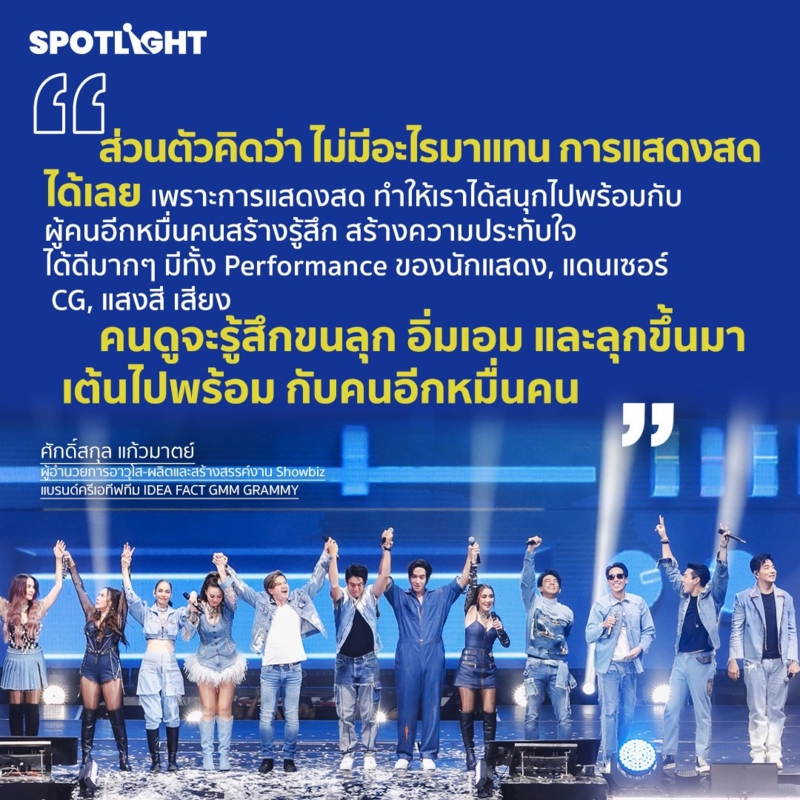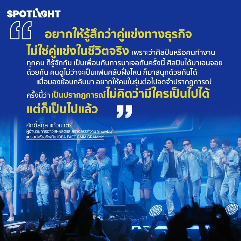 ปรากฏการณ์คอนเสิร์ตข้ามค่าย ส่งผลกระทบต่อวงการเพลงในภาพรวมอย่างไร และอะไรคือสาเหตุที่แฟนคลับยังยอมควักเงินครึ่งหมื่น เพื่อไปร้องและเต้นพร้อมกับคนอีกนับหมื่นคน Spotlight ชวนคุณศักดิ์สกุล แก้วมาตย์ แห่ง ‘IDEA FACT’ ผู้จัดมืออาชีพ ภายใต้หน่วยงาน GMM SHOW ในเครือ GMM GRAMMY ผู้อยู่เบื้องหลังหลากหลายคอนเสิร์ตในโปรเจกต์ครั้งประวัติศาสตร์นี้ ติดตามการสัมภาษณ์ฉบับเต็มได้ในรายการ Key Player เร็วๆ นี้ที่ Spotlight