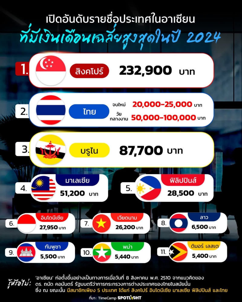 ล่าสุด Time Camp จัดอันดับรายชื่อประเทศในภูมิภาคอาเซียนและเงินเดือนของแต่ละประเทศจากมากไปน้อย ดังนี้: