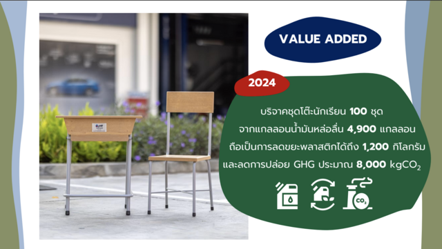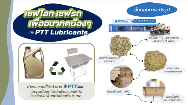 “เอาแกลลอนพลาสติกน้ำมันหล่อลื่นที่ใช้แล้ว มาผลิตเป็นผลิตภัณฑ์ทดแทนไม้เป็นเฟอร์นิเจอร์ สู่โครงการเซฟโลก เซฟรถ เพื่ออนาคตน้องๆ ซึ่งเป็นอนาคตของประเทศชาติ ทำโต๊ะ เก้าอี้นักเรียนไปให้เด็กนักเรียนในชนบทสนับสนุนการศึกษาในชุมชนที่ขาดแคลน ปีนี้เริ่มทำไปแล้ว 5 โรงเรียน โรงเรียนแรกที่โรงเรียนบ้านผานัง อ.แม่แจ่ม จ.เชียงใหม่”