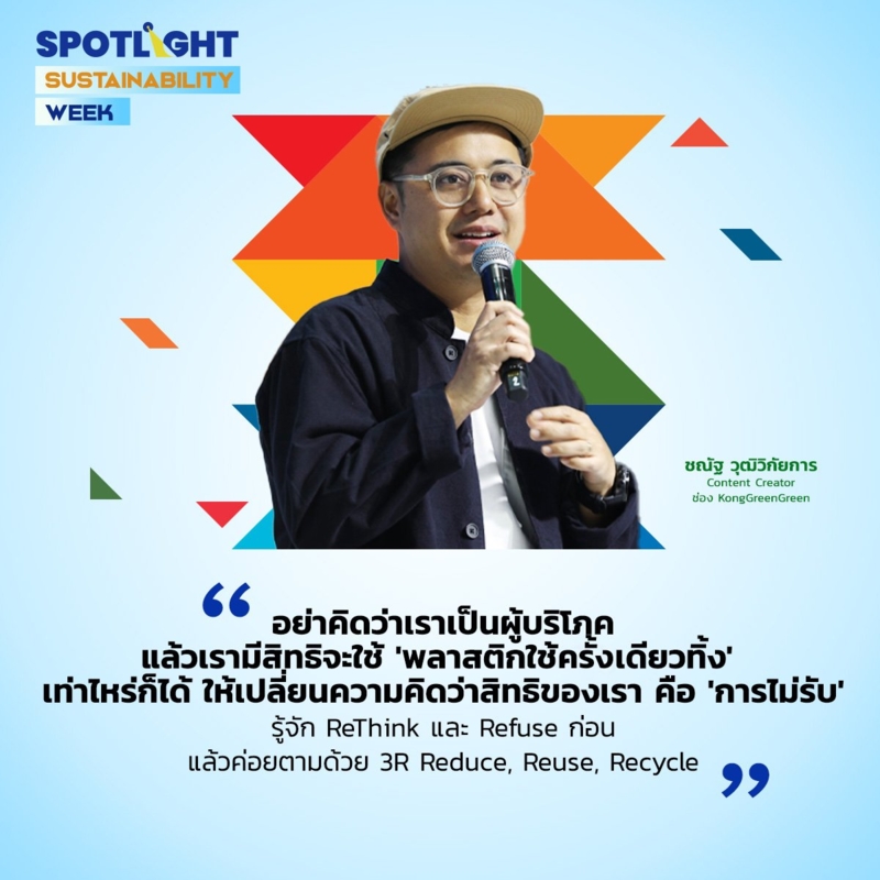 “เวลาไปซื้อของต่างประเทศ ไม่มีใครมานำเสนอพลาสติกใช้ครั้งเดียวทิ้งให้เราฟรีๆ แล้ว หลอด หรือแม้แต่ช้อนส้อม เพราะฉะนั้น อย่าคิดว่าเราเป็นผู้บริโภค แล้วเรามีสิทธิจะใช้ 'พลาสติกใช้ครังเดียวทิง' เท่าไหร่ก็ได้ ให้เปลี่ยนความคิดว่าสิทธิของเรา คือ 'การไม่รับ' รู้จัก ReThink และ Refuse ก่อน แล้วค่อยตามด้วย 3R Reduce, Reuse, Recycle” ชณัฐ กล่าว