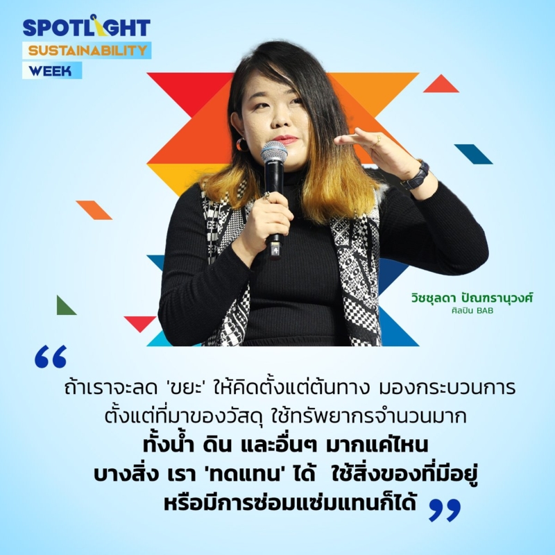 “ถ้าเราจะลด 'ขยะ' ให้คิดตั้งแต่ต้นทาง มองกระบวนการ ตั้งแต่ที่มาของวัสดุ ใช้ทรัพยากรจำนวนมาก ทั้งน้ำ ดิน และอื่นๆ มากแค่ไหน บางสิ่ง เรา 'ทดแทน' ได้ ใช้สิ่งของที่มีอยู่ หรือมีการซ่อมแซ่มแทนก็ได้” วิชชุลดา กล่าว