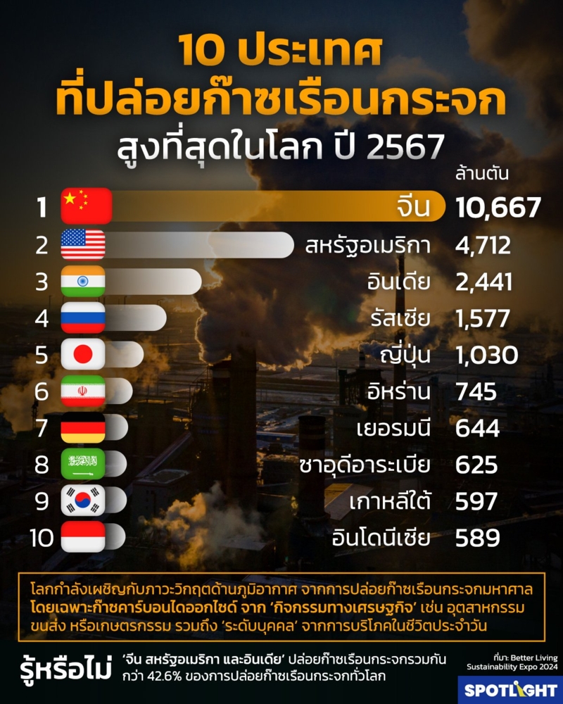 ส่วน 10 ประเทศที่มีการปล่อยก๊าซเรือนกระจกมากที่สุดในปี 2567 SPOTLIGHT สรุปออกมาดังต่อไปนี้
