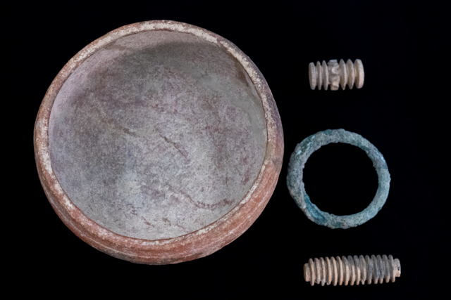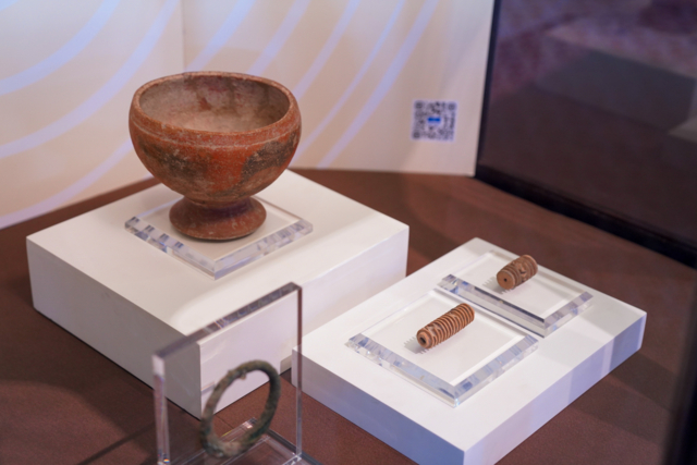 ภาชนะดินเผาโบราณ มีลายเขียนสีแดงเป็นเอกลักษณ์ กำไลข้อมือในสภาพเกือบสมบูรณ์ และลูกกลิ้งทรงกระบอก 2 ชิ้น ที่ยังไม่ทราบการใช้งานที่แน่ชัด โบราณวัตถุทั้ง 4 ชิ้นเหล่านี้ ถูกพิสูจน์โดยกรมศิลปากรแล้วว่า มีถิ่นกำเนิดมาจากพื้นที่แหล่งโบราณคดีบ้านเชียง ที่ตั้งรกรากและสถานที่ฝังศพของมนุษย์ยุคก่อนประวัติศาสตร์ อายุเก่าแก่กว่า 3,500 ปี ในจังหวัดอุดรธานี
