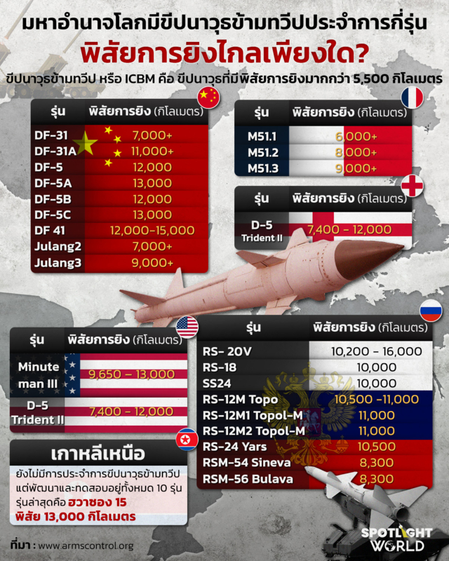 รัสเซียมีขีปนาวุธข้ามทวีปที่ประจำการอยู่ในกองทัพมากถึง 9 รุ่น โดยมีระยะการยิงไกลที่สุดคือ รุ่น RS-20V ที่ยิงได้ไกลที่สุดคือ 16,000 กิโลเมตร ขณะที่สหรัฐฯมีขีปนาวุธข้ามทวีปเพียงแค่ 2 ตัว